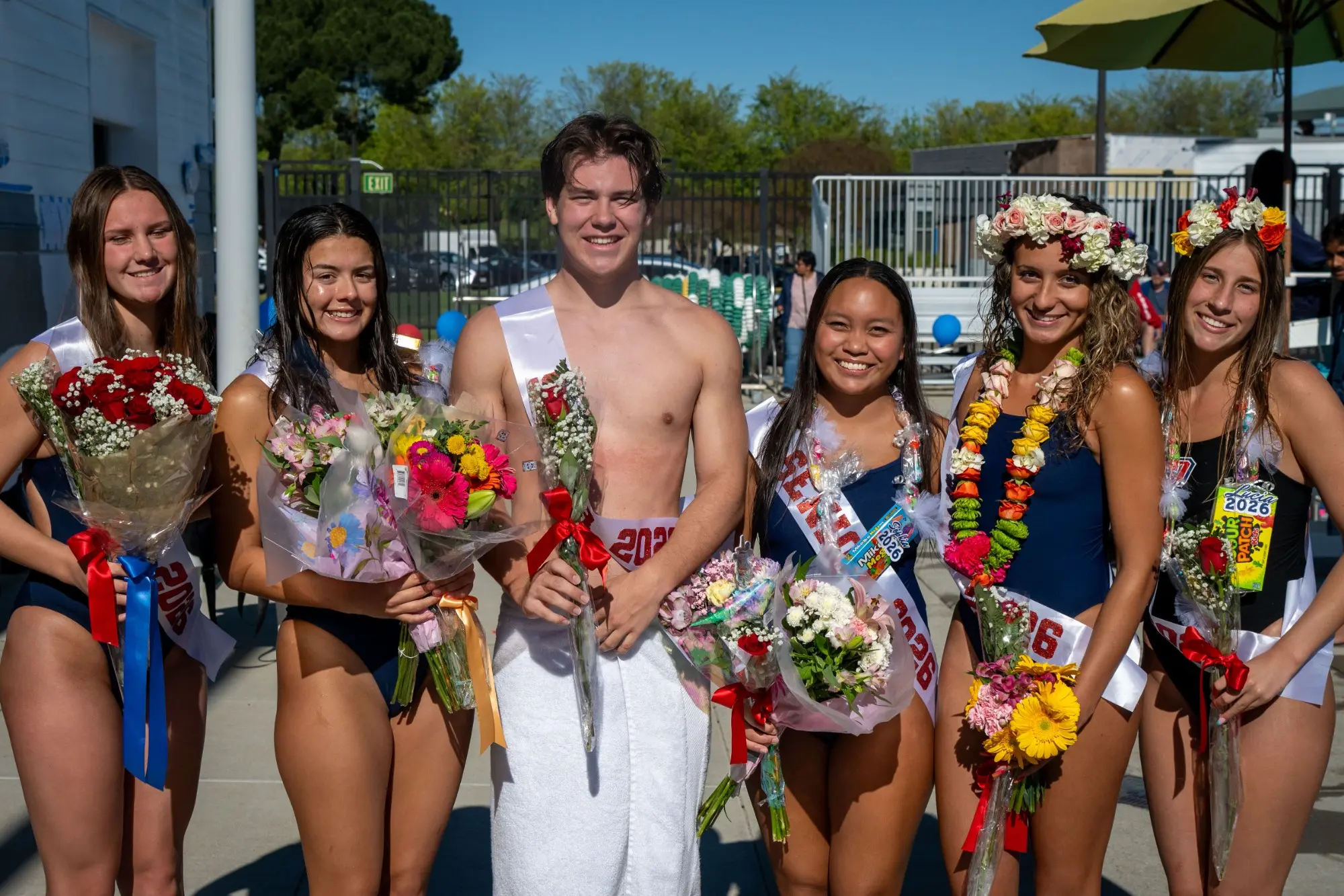 Before the first whistle, teammates, families, and coaches gathered on the pool deck for a special ceremony. Underclassmen formed a tunnel of cheers as each senior was introduced, draped in flowers and surrounded by custom banners.